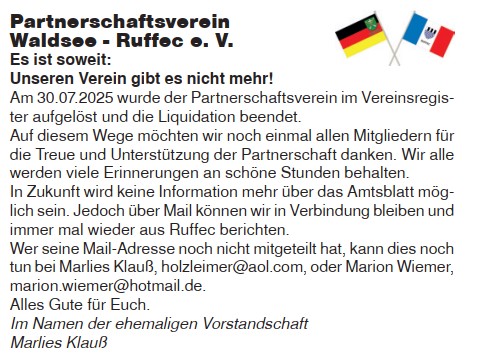 Zweck der Vereins ist die Pflege und Vertiefung der bestehenden Partnerschaft des Ortes Waldsee (Verbandsgemeinde Rheinauen, Pfalz, Deutschland) mit der Stadt Ruffec (Charente, Frankreich) durch :